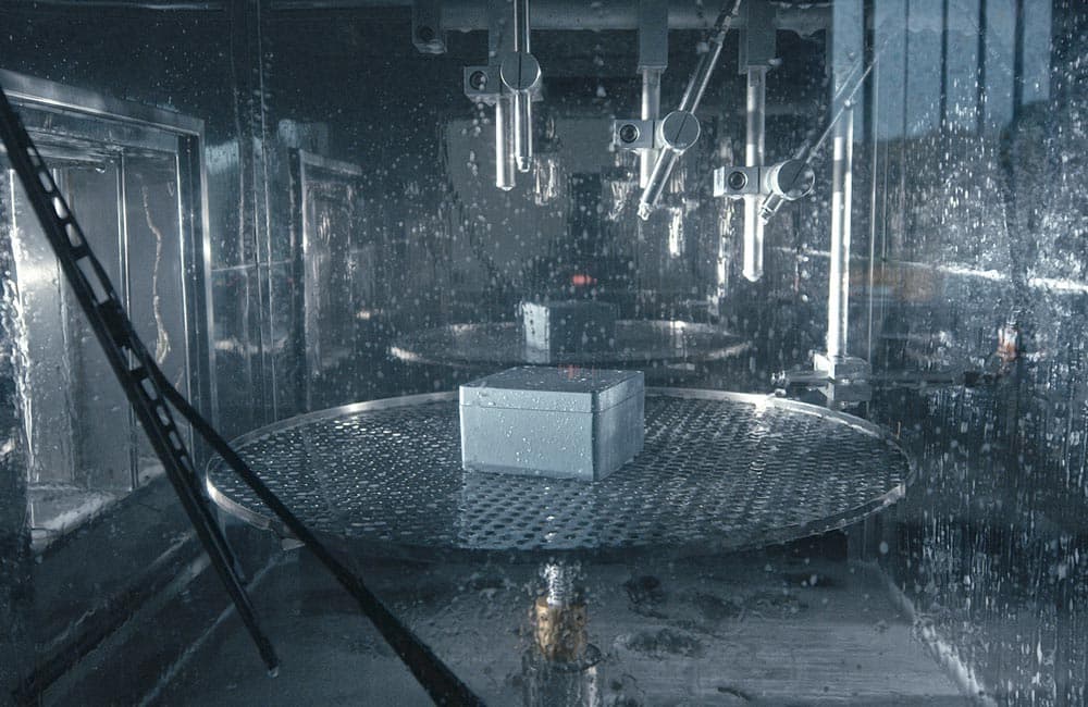 For the water protection test according to IP X5, X6, X7, X8 and X9K the enclosure is tested using our test systems according to the defined parameters. We regulate the water temperature and can install different nozzles to control the water flow and water pressure. For our customers, we test fully installed products to avoid failures due to water ingress.